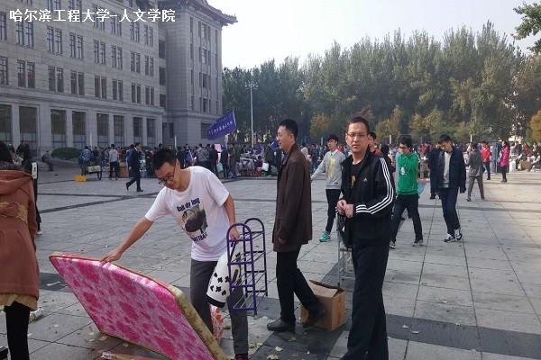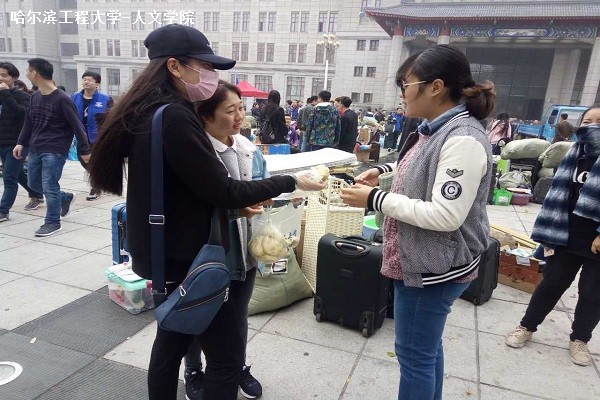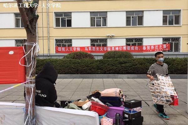 当雾气褪去,满载着行李的卡车随着太阳的升起也变得忙碌起来。学校在奥列霍夫广场上专门为学院划分的放置行李的缓冲区里,很快就填满了男生大大小小的行李。易碎的镜子和暖水壶、需要拼装的床上小桌、用来健身的哑铃等不易收纳的物件堆在行李中间显得不易认领,然而一群勤劳的志愿者的出现使得这些行李按类分放,并分别贴上了不同的标签以便区分。他们就是“小蜜蜂”社工社团的志愿者们,小蜜蜂不仅是社团的名称,也是他们对自己的定位――用爱心和帮助带来温暖和甜蜜。在行李缓冲区里,每当有一拨新的行李被运送过来,他们就会迅速地将其分类并安置在不同区域,保证了行李放置的安全和有序。志愿者们谈起自己的工作充满了自豪,对于这群有着多次志愿帮助经历的“小蜜蜂”们来说,能为搬寝活动贡献他们的力量着实是件快乐的事。