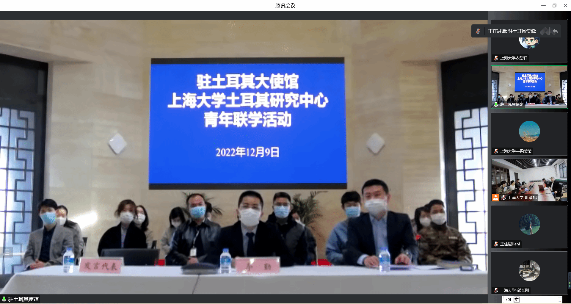 2022年12月9日,我中心与中国驻土耳其大使馆共同举办“学习宣传贯彻二十大精神,为中土关系发展建言献策”的青年联学活动。本次联学活动以线上线下相结合的方式举行,线下会场设在土耳其安卡拉的中国大使馆,来自大使馆、土耳其研究中心的三十余名青年代表参与了本次联学活动。