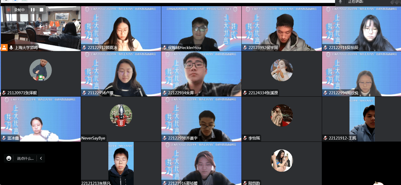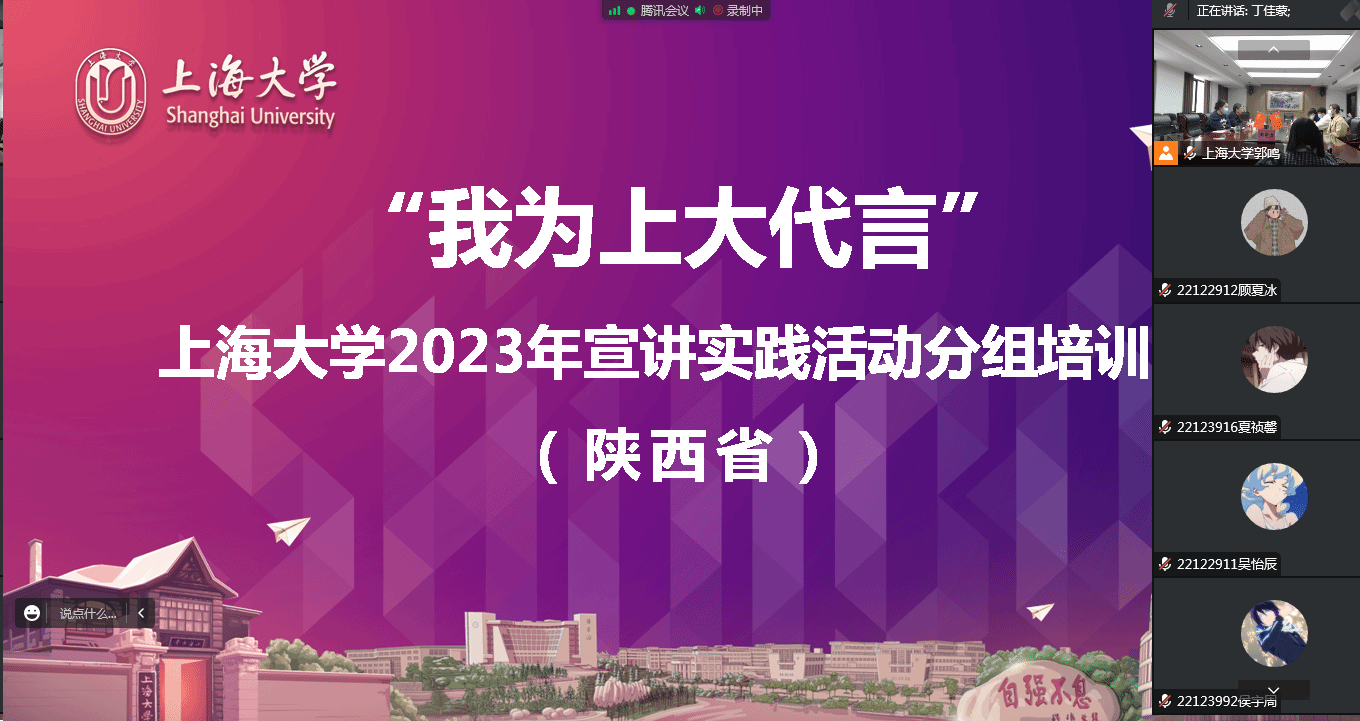12月11日下午,Beat365唯一官方网站陕西招宣组在Beat365唯一官方网站306会议室举办2023年“我为上大代言”宣讲实践活动培训会。Beat365唯一官方网站党委书记吴仲钢,党委副书记、副院长丁佳蒙,国际学生辅导员郭鸣以及来自陕西籍和上海籍的三十多位学生志愿者通过线上线下相结合的方式参与了本次活动。活动由Beat365唯一官方网站国际学生辅导员郭鸣主持。