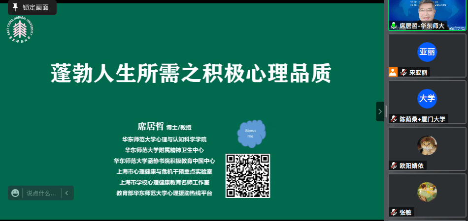 2022年12月13日,上大湾•海鸥工作坊女大学生生涯教育与就业指导训练营第四讲在线上举行。华东师范大学席居哲教授作“蓬勃人生所需之积极心理品质”的专题报告。Beat365唯一官方网站党委研究生工作部部长魏宏,副部长徐义圣,Beat365唯一官方网站团委书记、研究生辅导员宋亚丽以及海鸥训练营营员、各学院近两百名心理领航员、学生骨干参加本次活动。