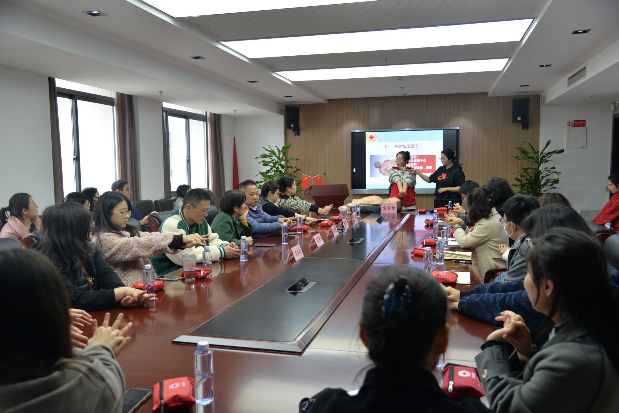 来自大场镇红十字会的张老师展开相关急救知识讲解,主要包括心肺复苏术(CPR)、自动体外除颤器(AED)的使用规范、海姆立克急救法、婴儿气道异物梗阻急救等,还为每位参与培训的师生发放了急救包。本次授课,她以幽默轻松、易于理解而又专业的方式向大家介绍心肺复苏等专业应急操作,并结合道具进行演示。