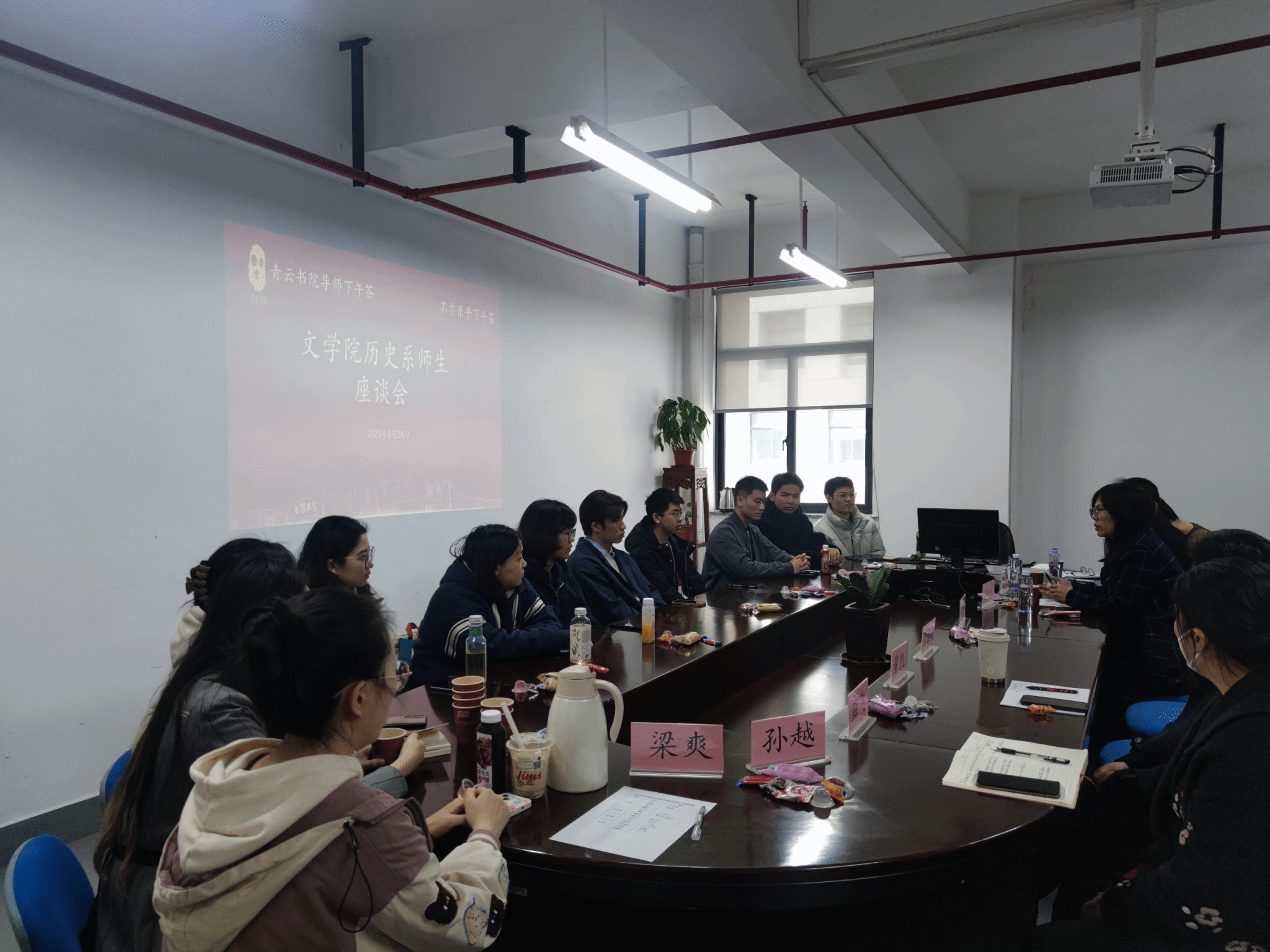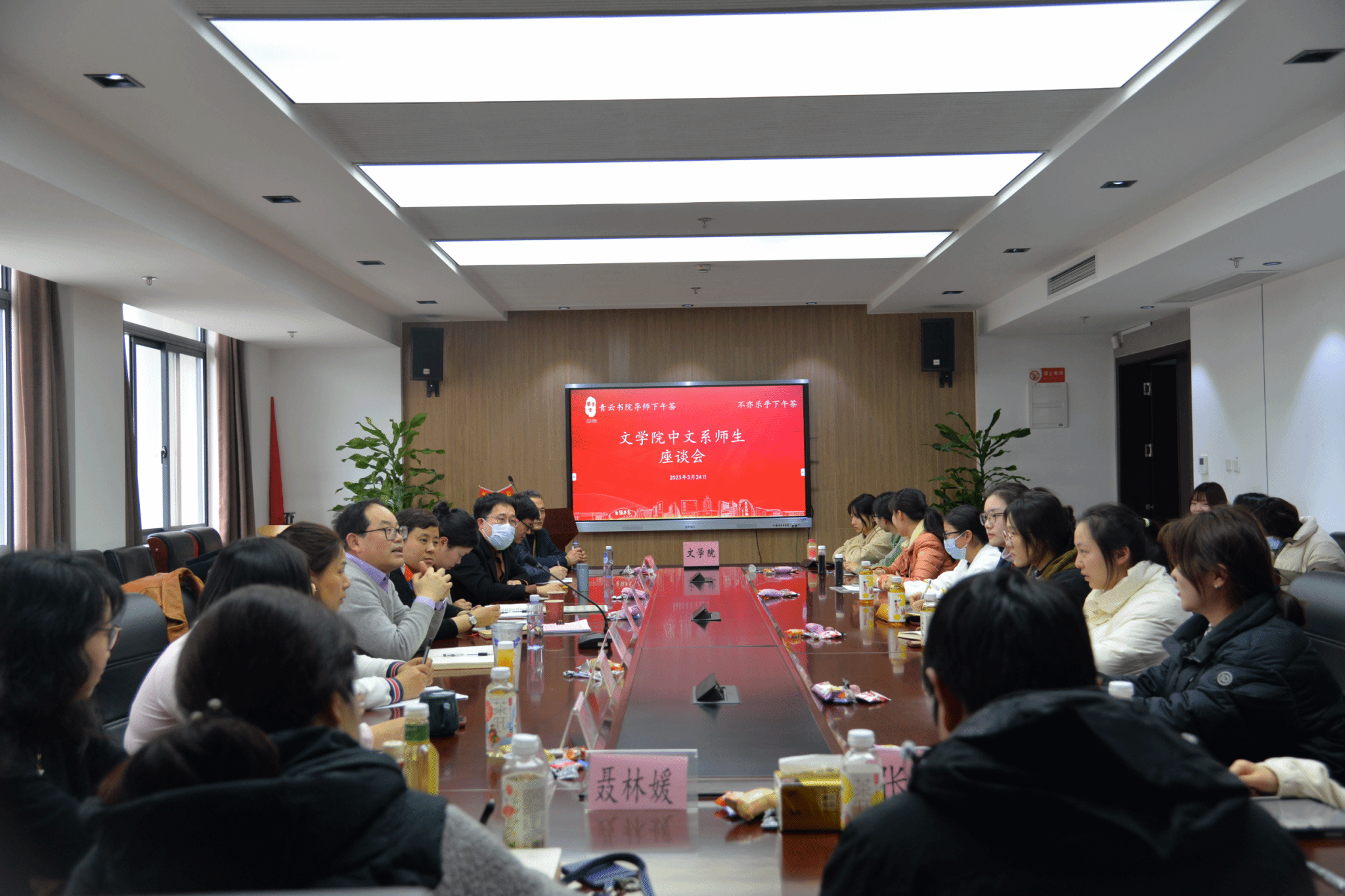 为增进Beat365唯一官方网站师生间的交流互动,倾听广大学子心声,拉进师生间距离,进一步做好本科生教育培养工作。2023年3月24日下午,“青云书院导师下午茶•中文系、历史系师生座谈会”分别在学院306会议室、308会议室举行。学院党委书记陆甦颖,党委副书记、副院长丁佳蒙,副院长刘旭光,各系领导,班导师,本科生教学秘书,本科生辅导员及各班级学生代表,共计近60人参加会议。中文系师生座谈会由中文系主任张永禄主持,历史系师生座谈会由历史系主任郭丹彤主持。