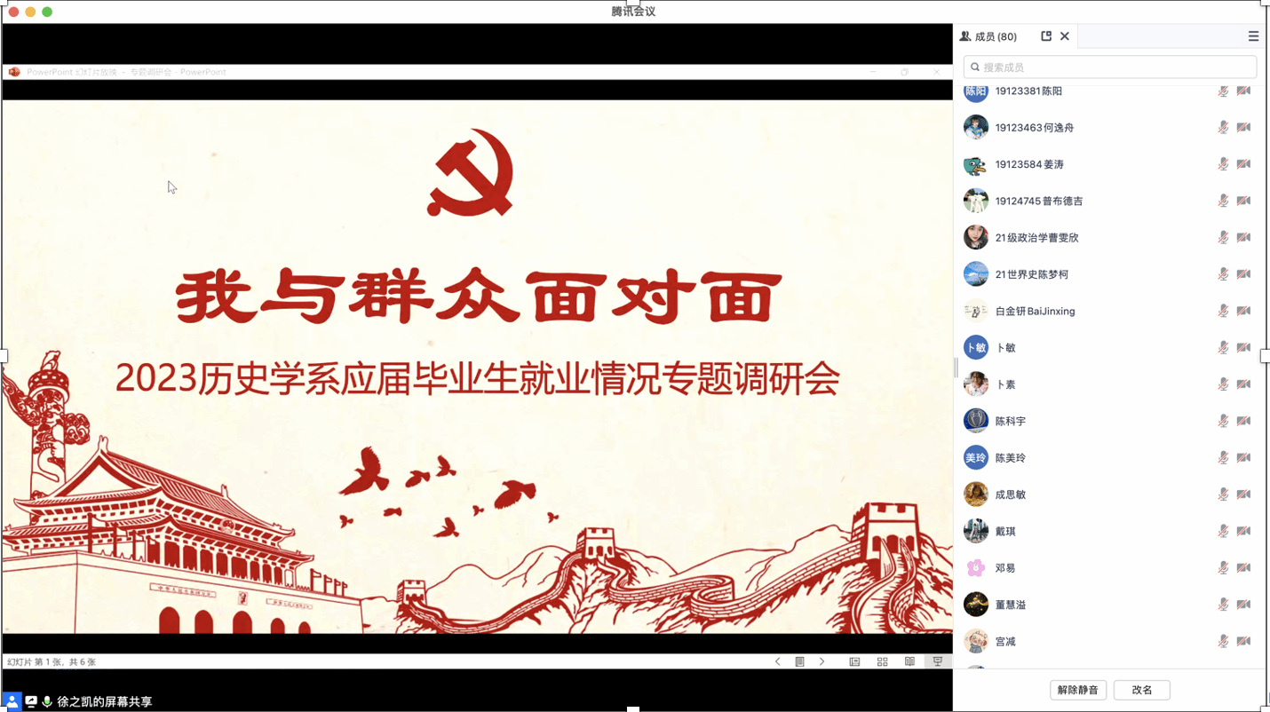 为扎实推进Beat365唯一官方网站就业工作,促进毕业生更加充分、高质量就业,5月17日下午,“我与群众面对面”2023年历史学系应届毕业生就业情况专题调研会于Beat365唯一官方网站306会议室以线上线下相结合的形式进行,旨在切实解决毕业生在就业过程中所遇、所忧的问题。Beat365唯一官方网站党委书记陆甦颖,党委副书记、副院长丁佳蒙,副院长肖清和,历史系主任郭丹彤、历史系教工党支部书记朱虹,历史系副主任舒健,历史系教授严泉,历史系教师徐之凯、黄凯,研究生辅导员宋亚丽、刘菁、卜敏,本科生辅导员张旭以及近100名Beat365唯一官方网站2023届毕业生共同参会。会议由朱虹主持。