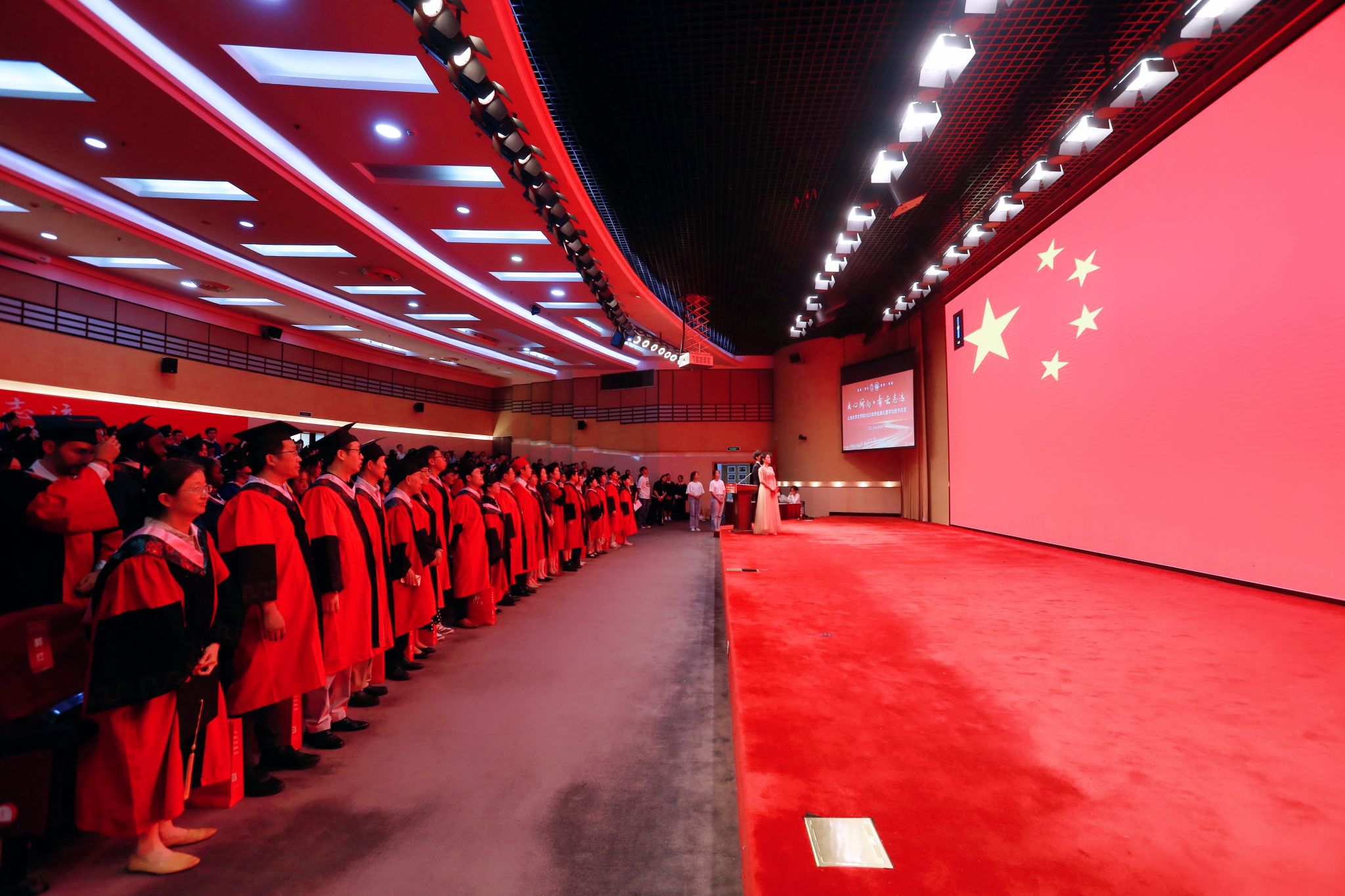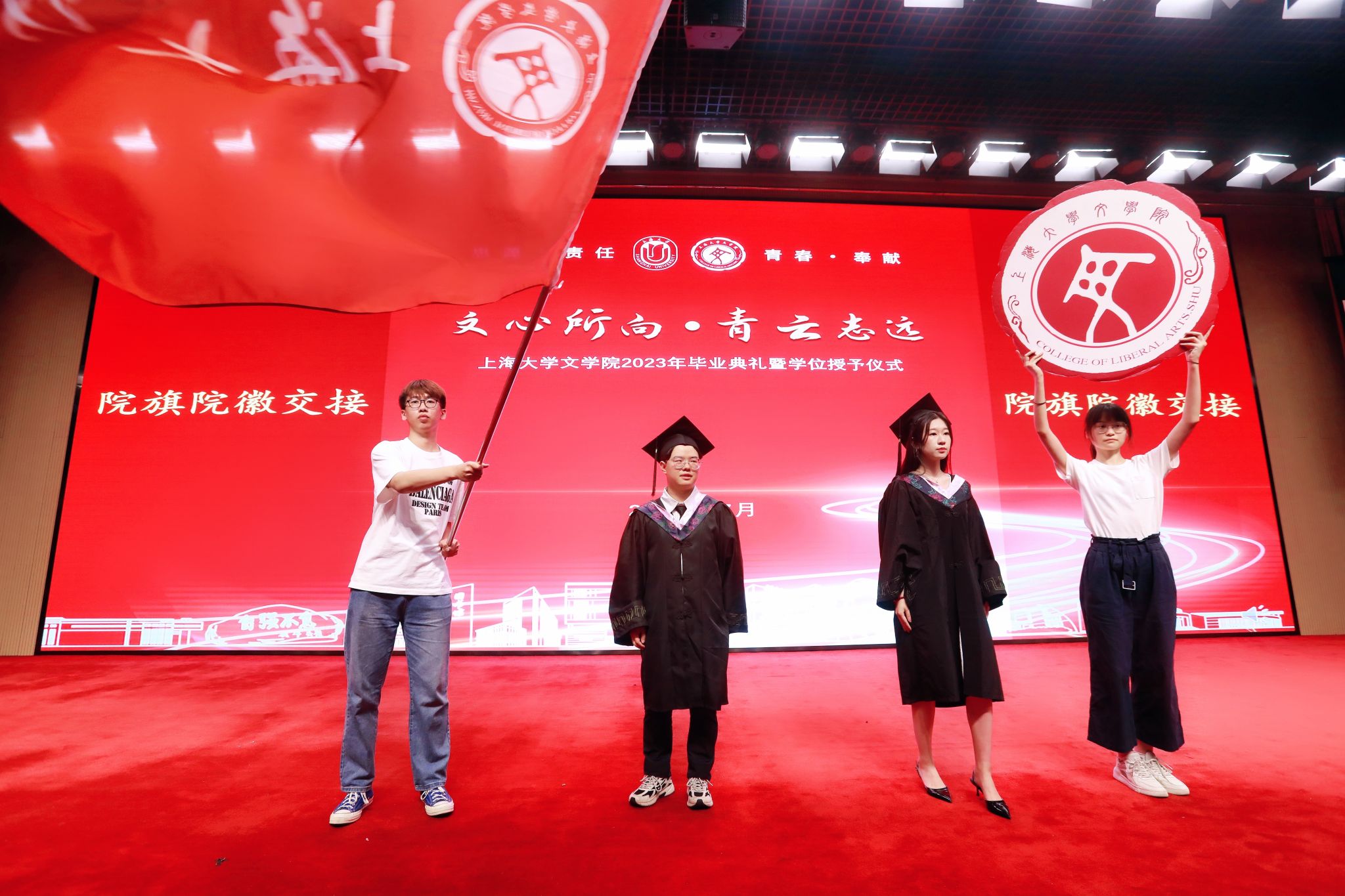 院旗、院徽秉承着上大人的自强不息,传承着文院人的精神风貌。2023届本科毕业生李轩宇和严语分别将院旗、院徽交到2022级新生孟泉翰和毛维凌手中,象征着文心与文脉的赓续传承。随后,全体师生起立,奏唱中华人民共和国国歌,为本次毕业典礼拉开了序幕。