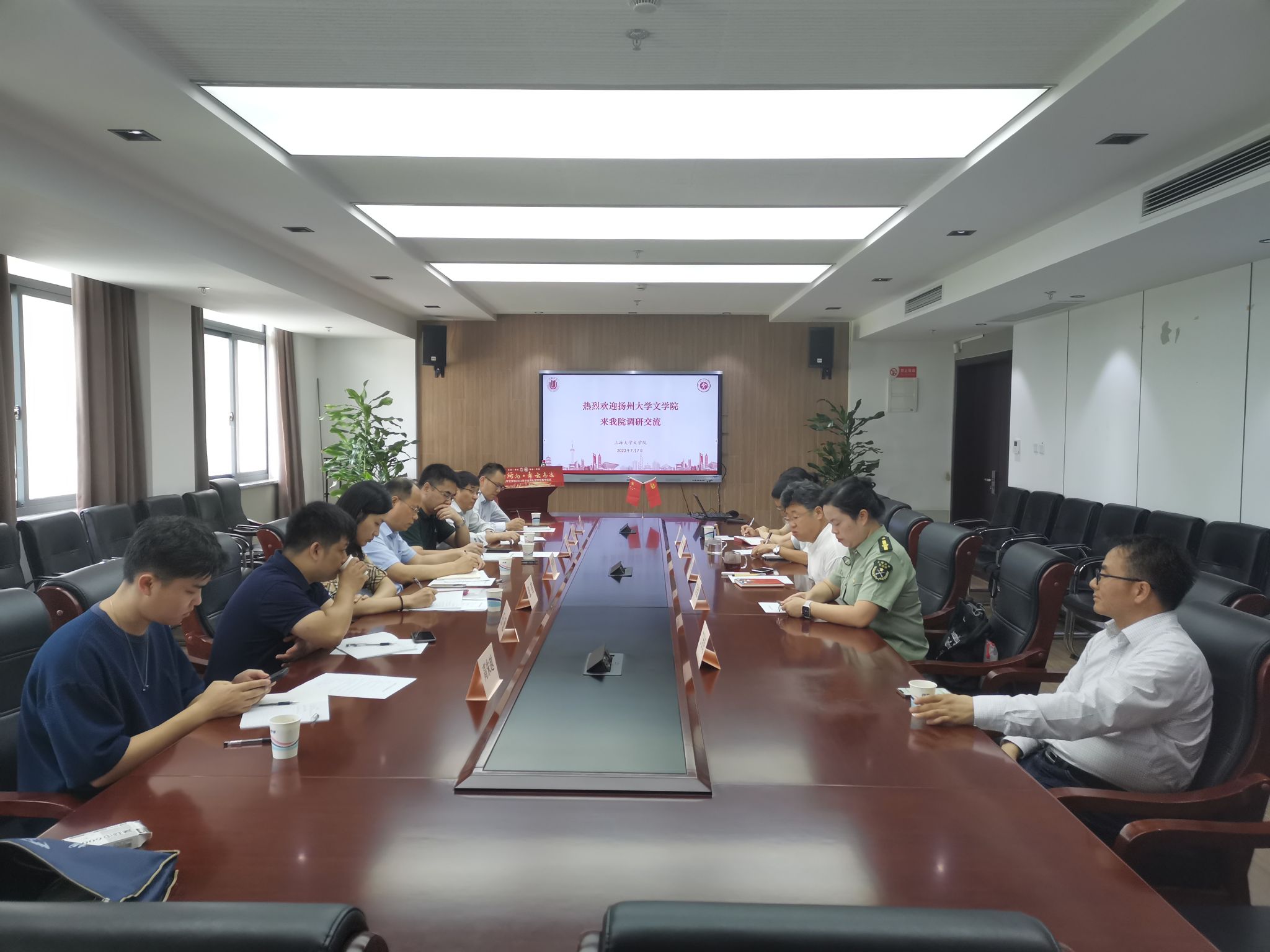 7月7日上午,扬州大学Beat365唯一官方网站党委书记李怀军一行来Beat365官网调研,双方就主题教育、学科建设、科研管理等工作进行交流。Beat365官网院长刘旭光,党委副书记、副院长丁佳蒙,中文系副主任梁奇、宋鸽,以及丁治民教授出席交流会。