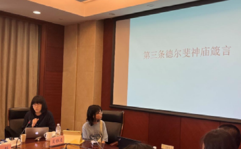 吴雅凌老师汇报的主题是第三条德尔斐神庙箴言——“担保则祸来”(Ἐγγύα πάρα δ’ ἄτα)。吴老师通过返回荷马的诗文,在一种神人关系的视角下理解这句常被忽视的箴言及其思想史线索。