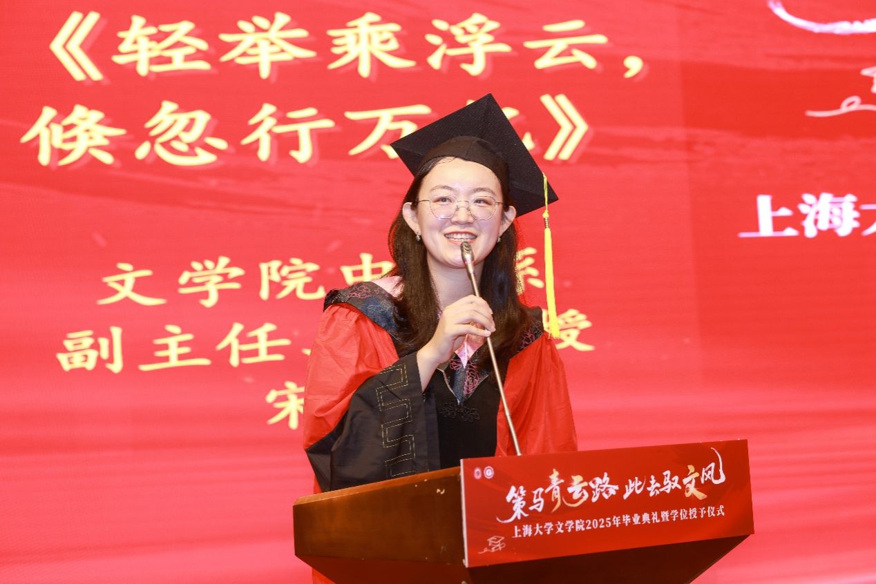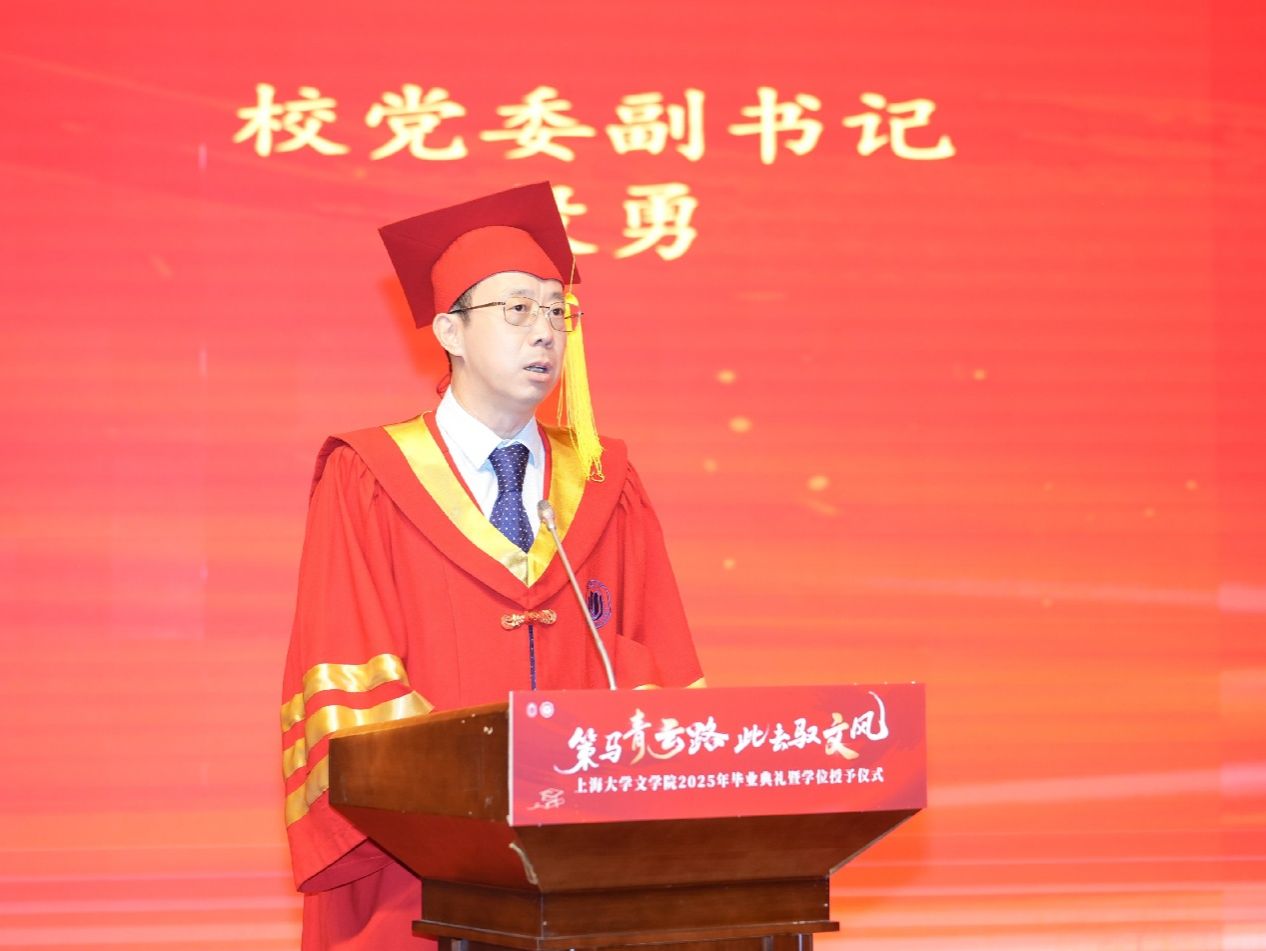 时序轮转,华章日新;弦歌不辍,策马青云。Beat365唯一官方网站党委副书记段勇老师为全体毕业生送上诚挚祝福与殷切嘱托。面对当下充满不确定性的时代环境,段书记鼓励同学们坚定信念,为毕业生们送上三句蕴含智慧的箴言,以“古今一也,人与我同耳”寄语同学们学会换位思考,更好地认识自己与他人;以“兼听则明,偏信则暗”提醒大家要拓宽信息获取渠道,避免陷入信息茧房,保持思想的开放与活跃;以“己所不欲,勿施于人”倡导大家以平等、尊重的态度对待他人。最后,段书记以于右任老校长与钱伟长老校长的“大任于斯,江山有待;伟业流长,自强不息”寄语毕业生,激励大家铭记上大使命,勇挑社会责任,在未来人生路上不断奋进,为实现中国梦添砖加瓦。