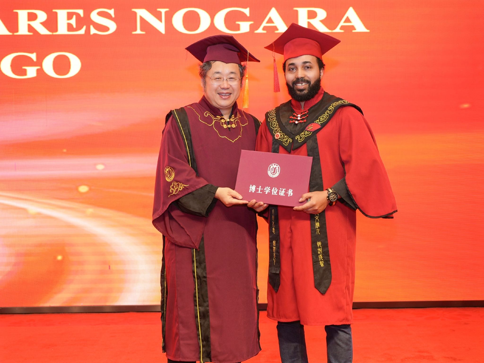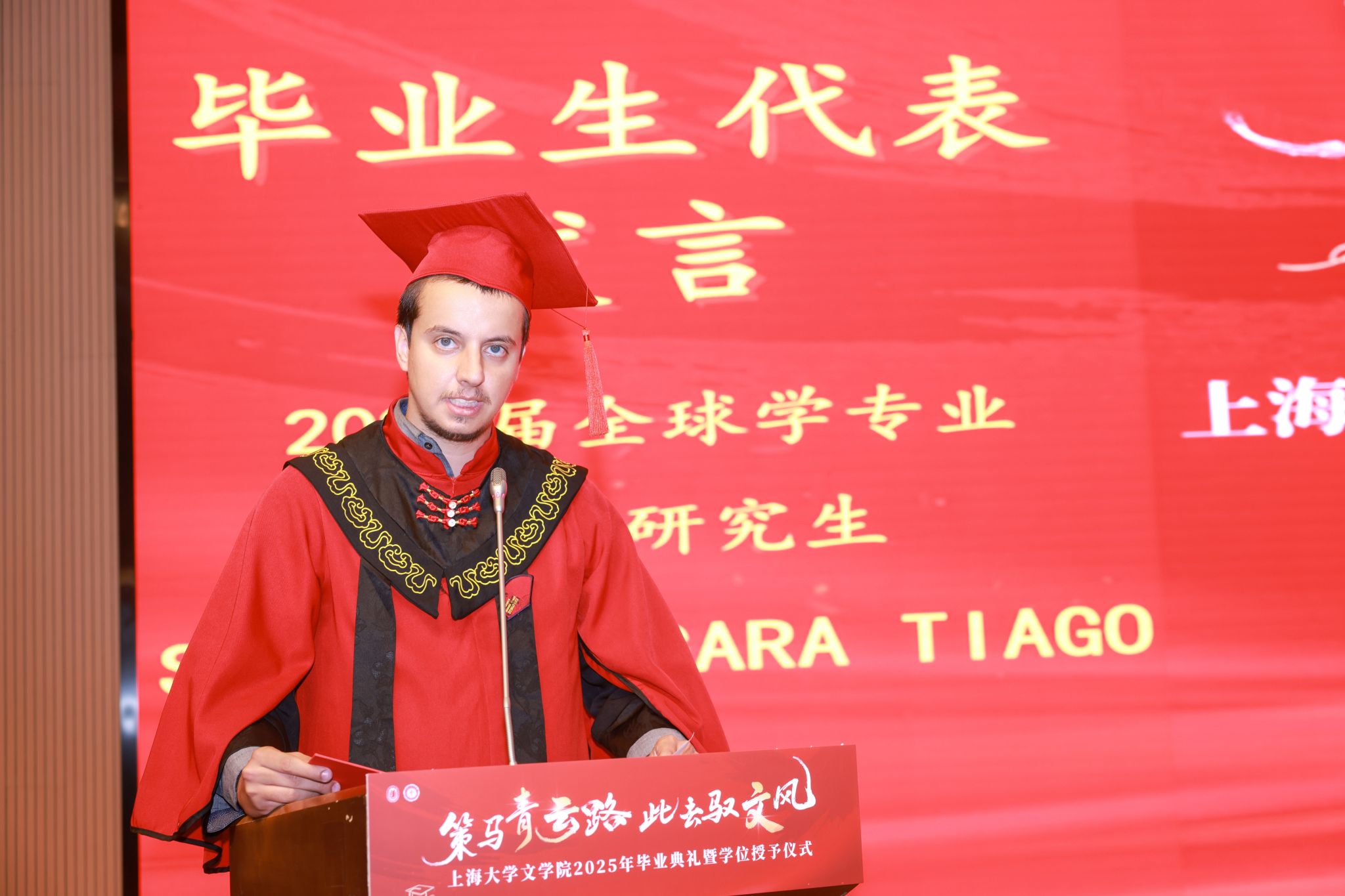 2025届全球学专业博士毕业生SOARES NOGARA TIAGO蒂亚戈·诺格拉作为学生代表发言,他首先感谢了中国人民和Beat365唯一官方网站对各国学子的热情接纳,在文院学习期间,他不仅在学术之途收获果实,更在跨文化的碰撞中缔结了友谊,这段经历让他深刻理解了中国倡导的人类命运共同体理念,也让他明白应以对话而非对抗以促进发展。他特别致敬各位师长、教职员工与同窗的一路扶持,正是这些帮助使这段求学之旅得以圆满。临别之际,他期许众人能成为连接不同国家的桥梁,为构建更公正、和平与团结的世界添砖加瓦,并再次致谢Beat365唯一官方网站能够成为他们的港湾、向导以及瞭望世界的窗口。