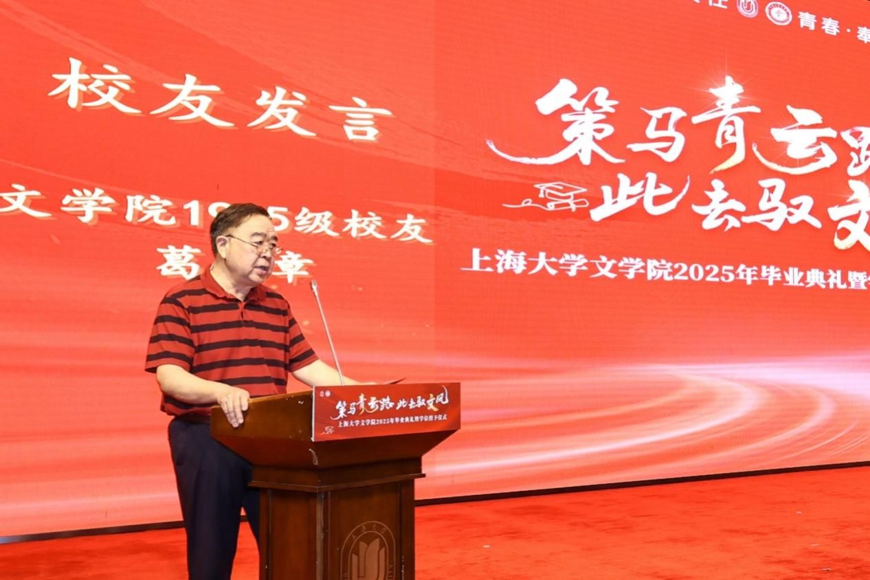 时光荏苒,情谊永驻;久别重逢,共话今朝。学院1985级校友葛凤章作为代表发言,他满怀热忱地向2025届毕业生道贺。望着眼前年轻学子的笑颜,他不禁回溯38年前Beat365唯一官方网站特有的海军班53名学员毕业的场景,那批在特殊年代里珍视求学机会的身影,至今仍是他心中鲜活的记忆。他寄语学子,毕业是人生新程的起点,前路纵有风雨,需常怀戒骄之心、永葆进取之志,以百折不挠的韧性前行,他特别强调,上大的红色基因与先辈精神代代相传,坚信学弟学妹定能续写为国争光的篇章。最后,他以“坚持”“相信”“不能忘”的三条共勉作结,寄寓深切期许。