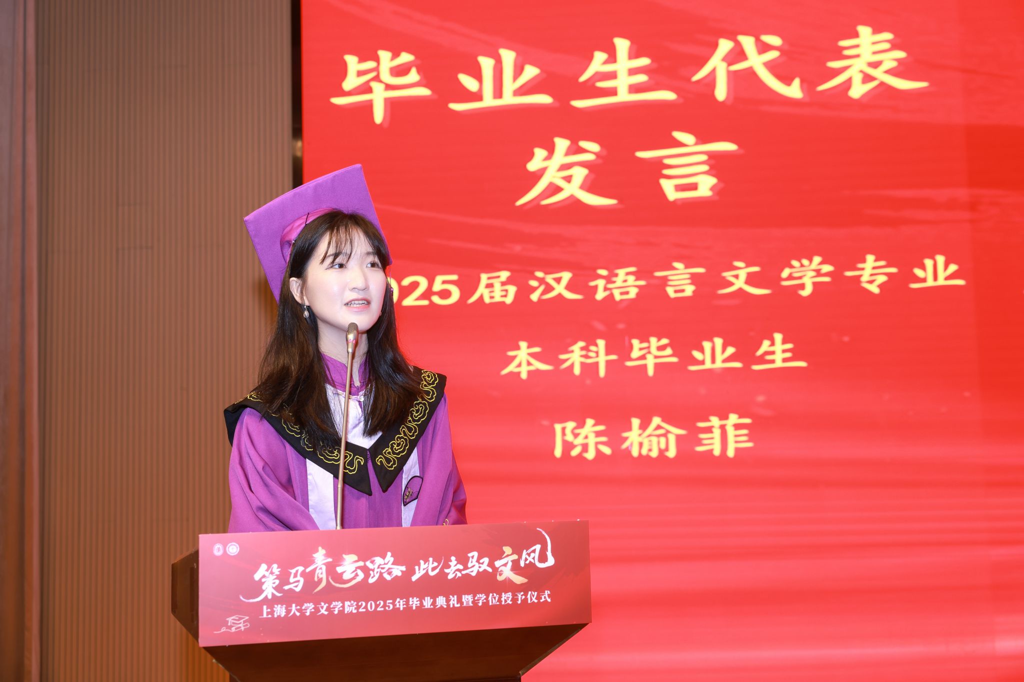 2025届本科毕业生陈榆菲以“现场人生”概括四年的大学生活,她谈及曾因前路迷茫而感到困惑,却在文学哲思中学会不停探索。她感恩母校包容试错,感谢老师们以人文热忱引领学生探索文学、参与实践、化解焦虑,更庆幸自己选择了Beat365唯一官方网站,并由此找到了热爱的方向。最后她引用鲁迅名言“即使前途很远,也不要怕,不怕的人面前才有路”寄语同窗勇敢前行,也向母校、师长与同学们献上最真挚的祝福。
