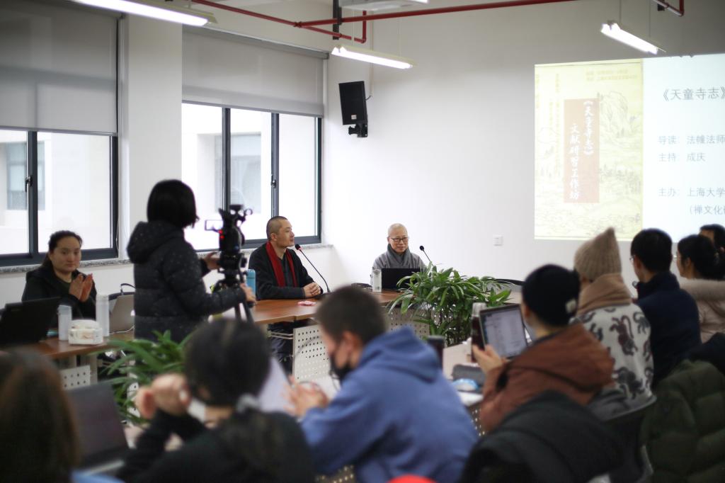 1月1日的工作坊,法幢法师则讲解佛教方志的特色、价值和研究状况,提醒学员注意具体方志的编撰目的、体例,并带领学员梳理了天童寺志的不同版本和内容概要。在晚间课程中,学员分享了二十几位天童祖师资料的研习成果,最终法幢法师展望了天童文献未来的整理和研究工作,成庆老师介绍了下一步文献数据库的建立与禅宗语录读书会的规划,为期三天密集的工作坊在夜色中落下帷幕。