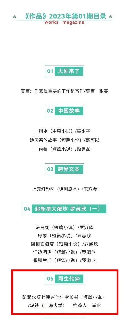 近日,广东省作家协会主办的著名文学刊物《作品》2023年第1期,推出中文系2020级本科生李骏飞(笔名冯铗)的小说《防溺水反封建迷信告家长书》。