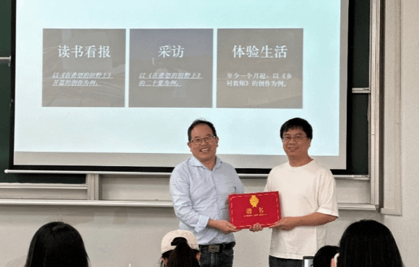 10月16日下午,中文系主任张永禄教授在FJ306教室为著名编剧饶俊举行兼职教授受聘仪式,仪式结束后饶俊教授作了题为《生活:戏剧创作之本》的学术讲座。创意写作学科的部分师生参与本次活动。