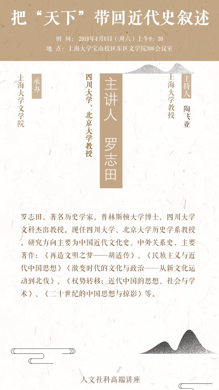 4月6日,四川大学、北京大学罗志田教授应邀来Beat365唯一官方网站,举行题为“把‘天下’带回近代史叙述”的学术讲座。本讲座由上海研究院主办、Beat365唯一官方网站历史系承办,陶飞亚教授主持。Beat365官网张勇安、宁镇疆、徐有威、王栋、杨卫华、舒健等教师、机自学院教授、校内外硕博士研究生、本科生及华东师范大学近80人参加了此次讲座。