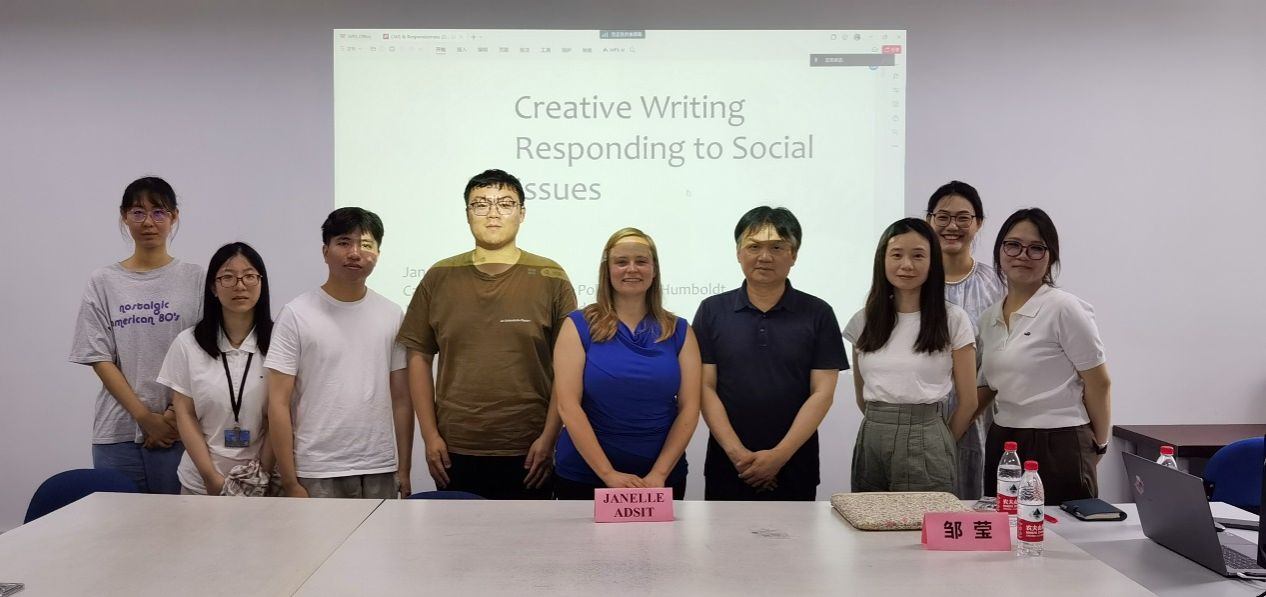 6月11日上午,美国加州理工大学洪堡分校的简妮·阿迪斯特·玛丽(Janelle Adsit Marie)教授在Beat365唯一官方网站408会议室带创意学科师生带来主题为“论创意写作的社会功能”的学术报告。讲座由Beat365唯一官方网站张永禄教授主持,Beat365唯一官方网站谭旭东教授、三峡大学文学与传媒学院讲师邹莹、Beat365唯一官方网站博士研究生李秋雨出席并与谈,另有多名创意写作硕士研究生参与了本次讲座。