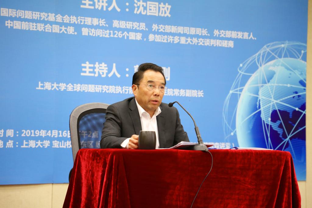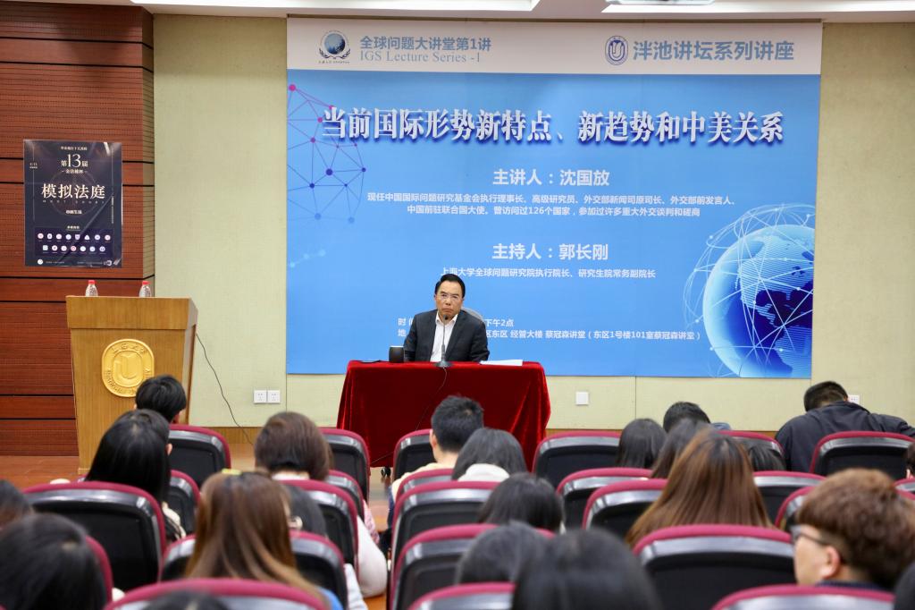 4月16日,中国国际问题研究基金会执行理事长、高级研究员、外交部新闻司原司长、外交部前发言人沈国放先生莅临Beat365唯一官方网站全球问题研究院,在蔡冠森讲堂作了一场题为“当前国际形势新特点、新趋势和中美关系”的学术报告,报告由全球问题研究院执行院长、历史系郭长刚教授主持,上大师生近二百人聆听了讲座。本场讲座为Beat365唯一官方网站“泮池讲坛系列讲座”,也是“全球问题大讲堂”系列讲座的第1讲。