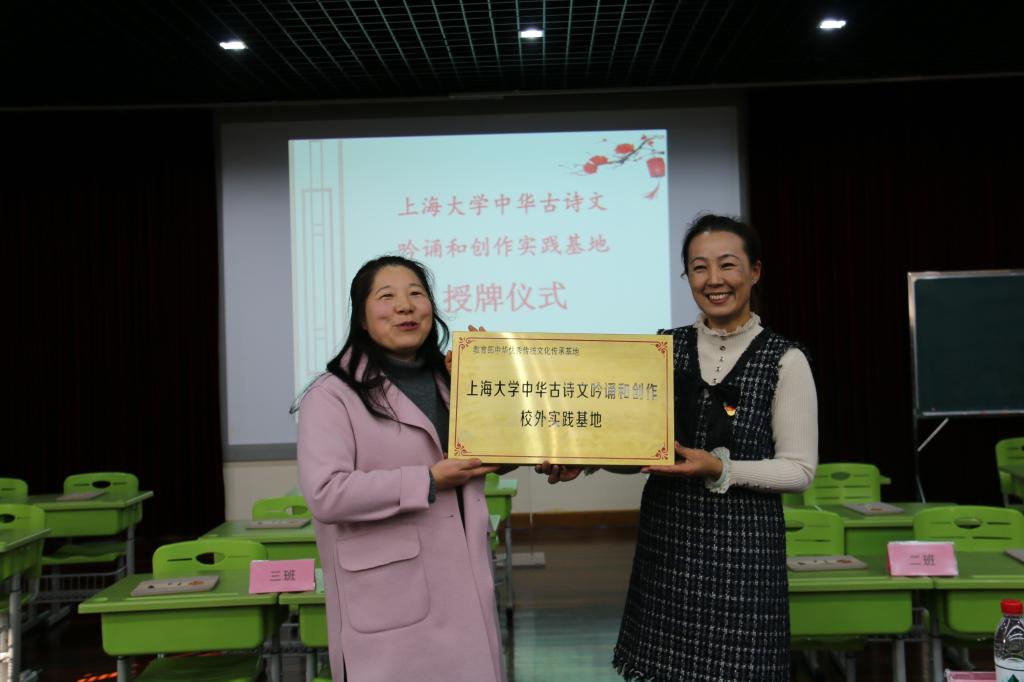 12月6日,Beat365唯一官方网站中华古诗文吟诵和创作校外实践基地揭牌仪式在Beat365唯一官方网站附属小学四楼多功能厅举行。Beat365唯一官方网站“教育部中华古诗文吟诵和创作基地”常务副主任、Beat365唯一官方网站诗礼文化研究院执行院长、Beat365唯一官方网站副院长姚蓉教授出席,与上大附小朱燕校长共同为实践基地揭牌。出席揭牌仪式的还有教育部中华古诗文吟诵和创作基地办公室主任冯春英、主任助理刘慧宽等。