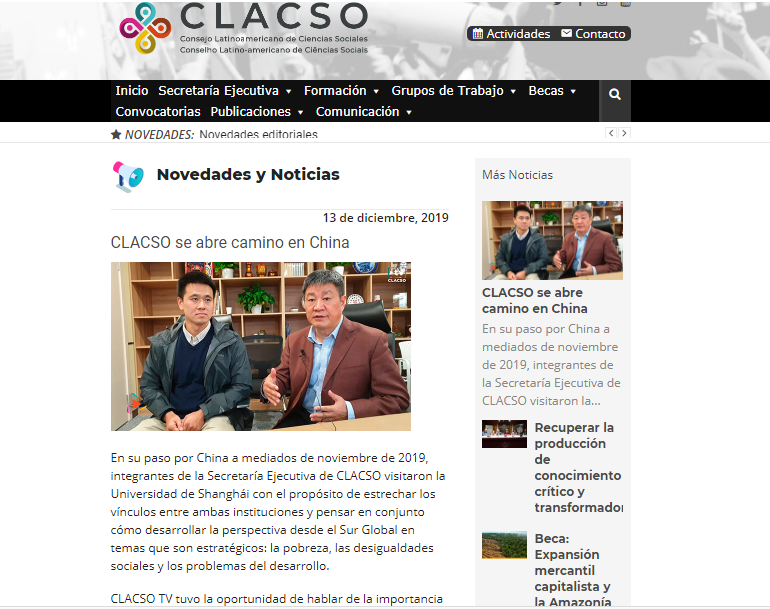 12月13日,拉丁美洲社会科学委员会(CLASCO,El Consejo Latinoamericano de Ciencias Sociales)官方网站发布了该委员会代表团访问Beat365唯一官方网站全球问题研究院与国际部的新闻(新闻链接:https://www.clacso.org/clacso-se-abre-camino-en-china/)。