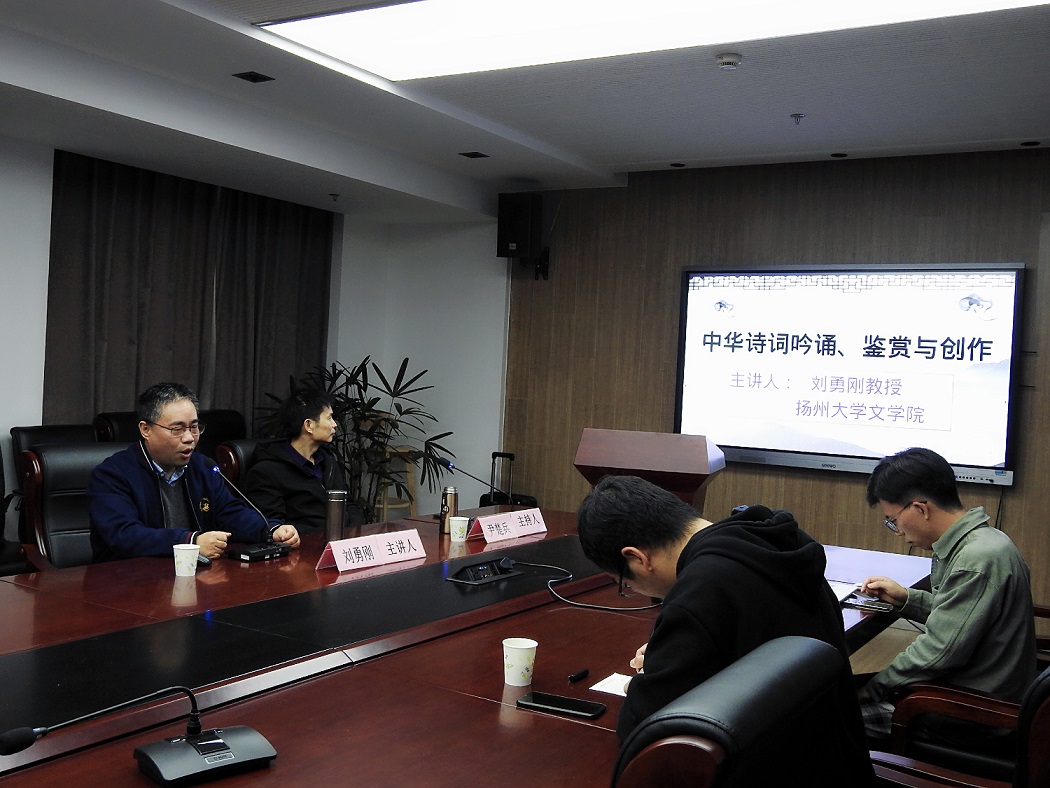 11月19日下午,扬州大学刘勇刚教授应“教育部中华古诗文吟诵和创作基地”之邀,在Beat365唯一官方网站306会议室作了一场题为“中华诗词吟诵、鉴赏与创作”的讲座。讲座由尹楚兵教授主持,除了在座数十位学生得以现场聆听外,来自不同学校的师生也通过腾讯会议的形式实现线上共享。