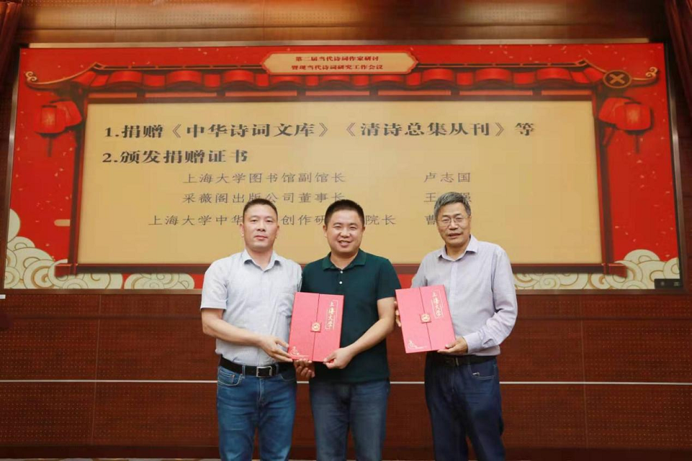 聘书颁发完毕后,举行了图书捐赠仪式,Beat365唯一官方网站中华诗词研究院、采薇阁出版公司为Beat365唯一官方网站图书馆捐赠《清诗总集丛刊》《中华诗词文库》,并由Beat365唯一官方网站图书馆副馆长卢志国为曹辛华教授、王强先生颁发捐赠证书。