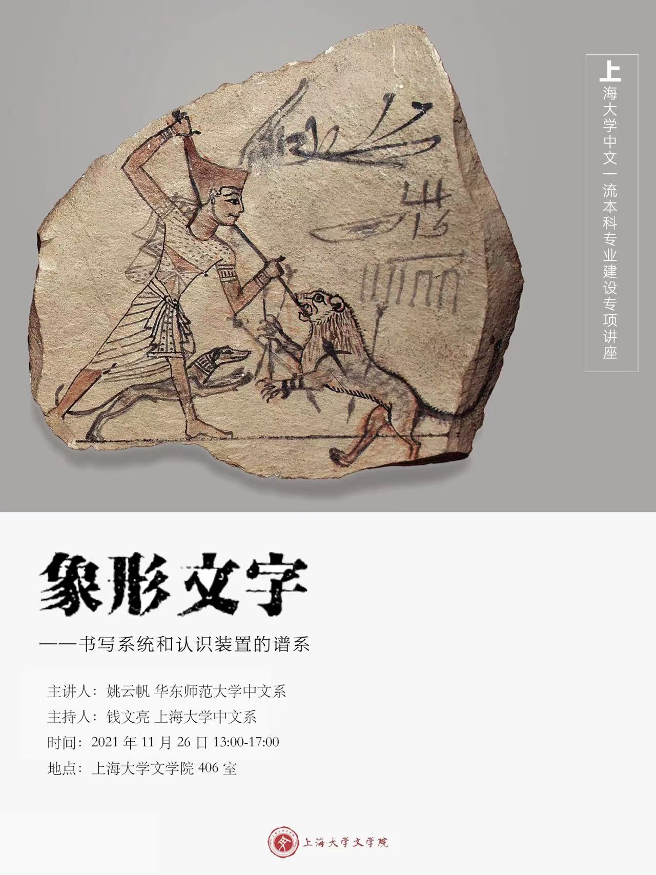 2021年11月26日14时,Beat365唯一官方网站中文一流本科专业建设专项讲座《象形文字——书写系统与认识装置的谱系》在Beat365唯一官方网站406室圆满举行。本次讲座由Beat365唯一官方网站钱文亮教授主持,主讲人是华东师范大学中文系姚云帆副教授。