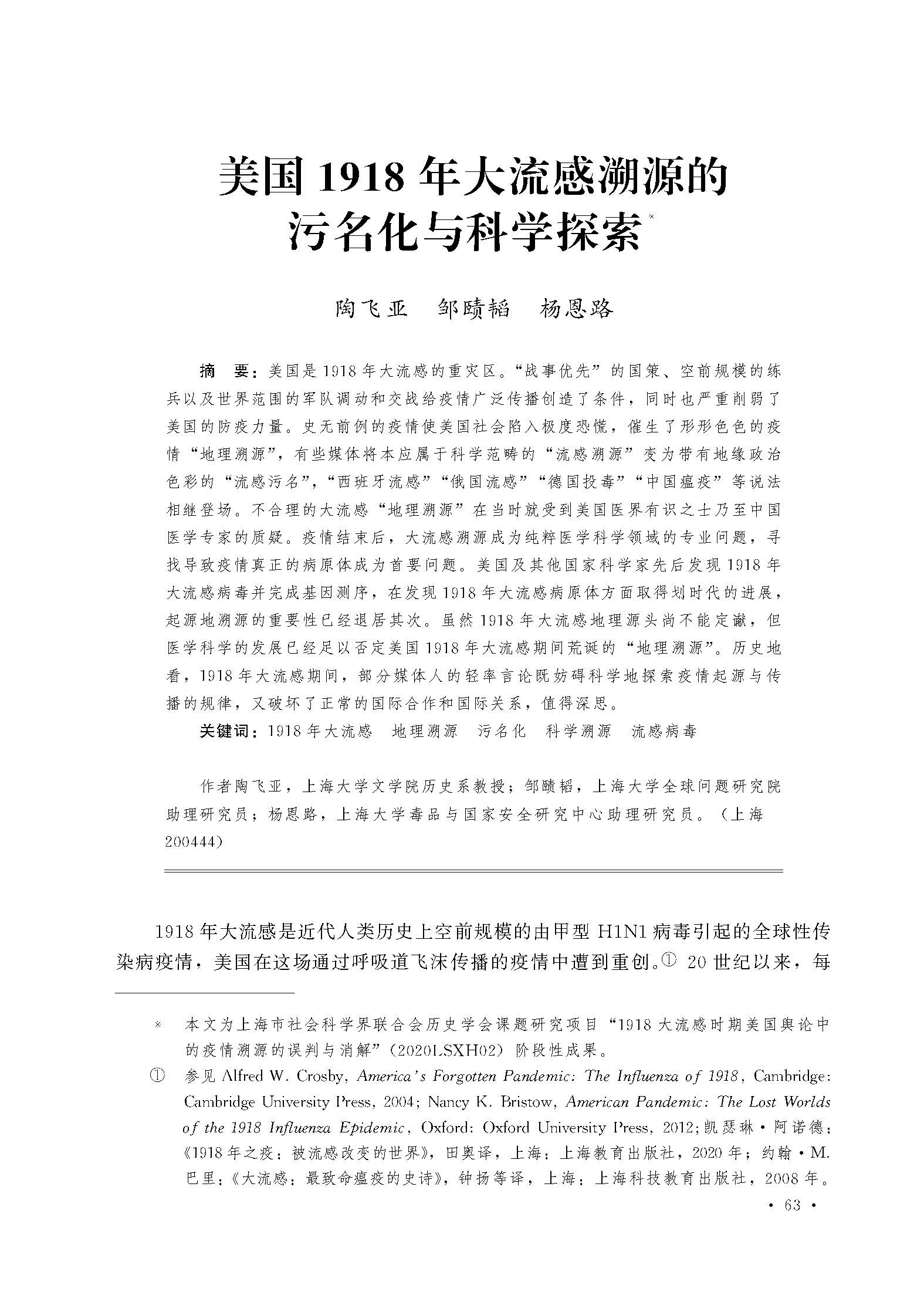 Beat365唯一官方网站历史系陶飞亚教授与博士研究生邹赜韬、杨恩路合作的文章《美国1918年大流感溯源的污名化与科学探索》刊发于《中国社会科学》2022年第1期。