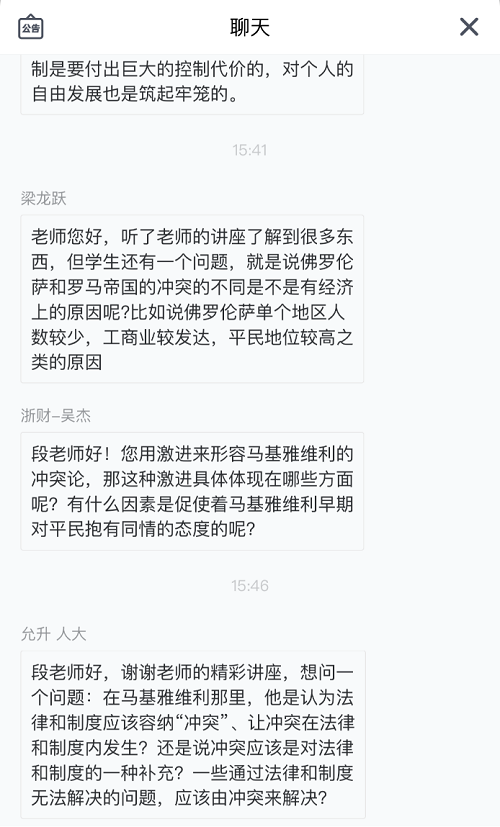 本次讲座获得了同学们的热烈反馈。如下图所示,关于讲座中的马基雅维利冲突内容,许多同学在聊天区提出问题并交流了想法。