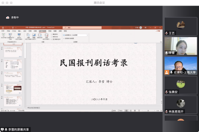第一位发言的是李雪博士,她的发言题目是《民国报刊剧话考录》。李雪博士从“报刊剧话”的界定、资料来源,剧话的分类等做了详细的分享。李雪博士的合作导师曹辛华教授进行了点评,提出了宝贵建议,并结合自己的过往经历为大家分享了自己学术研究的方法和心得。