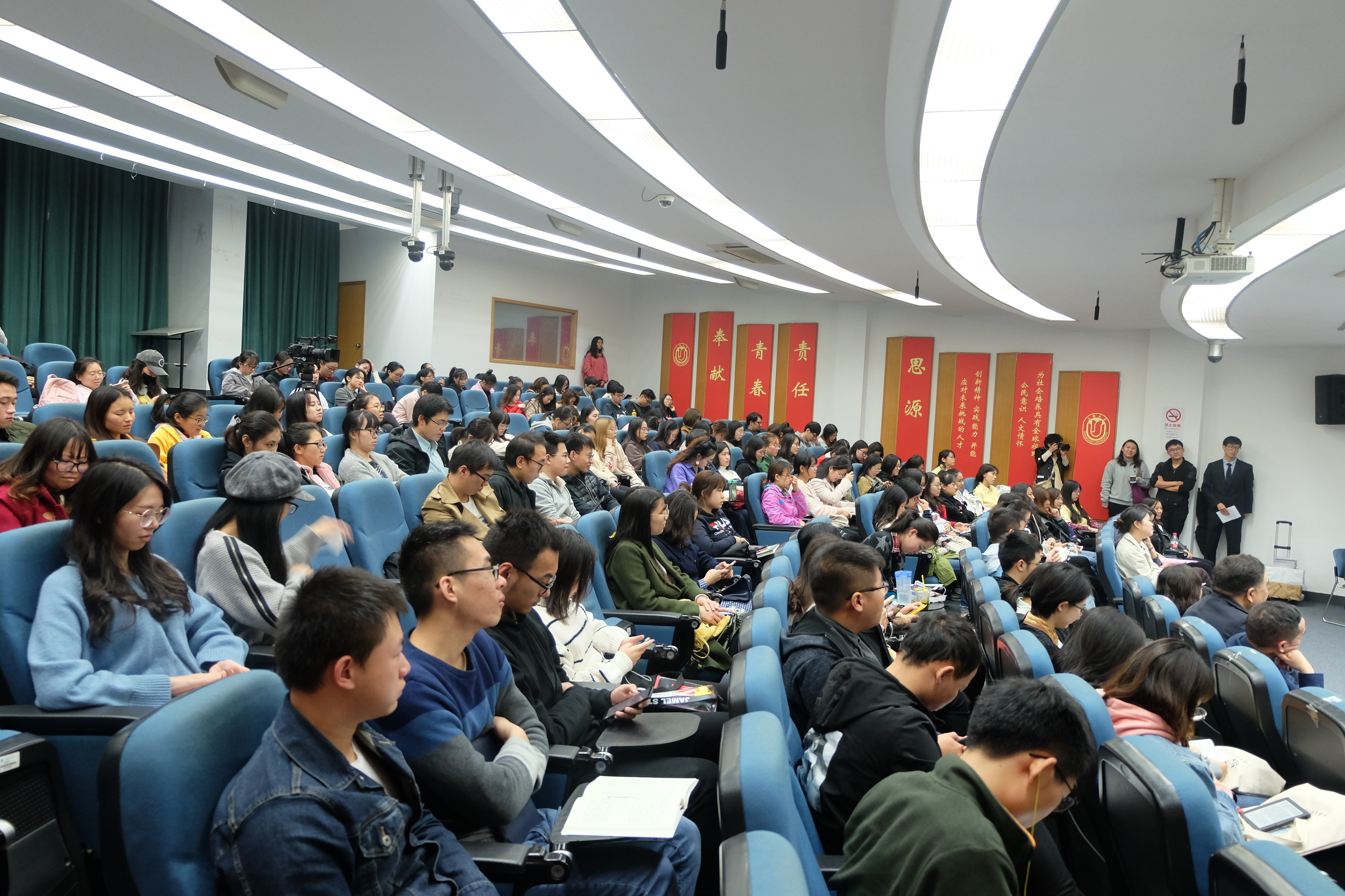 2018级研究生首日教育以Beat365唯一官方网站校友讲坛第四讲为背景,以庆祝Beat365唯一官方网站建院40周年为主题,通过讲述同在上大文院学习生活的两代人的故事,旨在让研究生新生了解在不同时代背景下,为适应国家和学校战略,Beat365唯一官方网站及文院师生所经历的变化,同时坚定理想信念,树立远大抱负。致力于两岸交流与对台宣传的校友葛凤章带来了演讲《让人生经得起回忆》,他用行动诠释了“神圣事业,匹夫有责”的真正含义;校友葛迎则以自己最真切的经历演讲了《专业之于职业,文学管理的超越》,并号召在校学生们要多参加社会实践,丰富自己的人生经历;校友陈志华、陈域栋父子在视频中表达了对母校及学院的感谢和祝福!