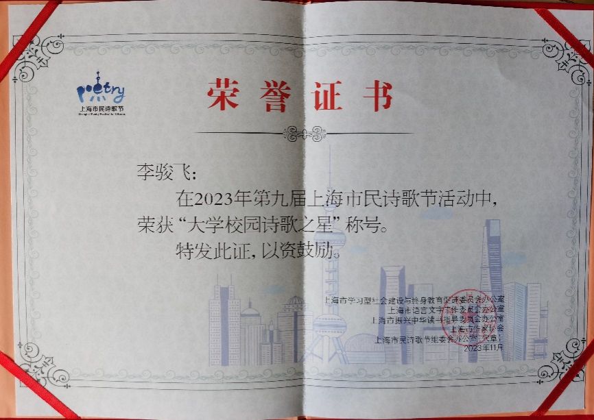 2023年11月20日,第九届“上海市民诗歌节”颁奖典礼“诗歌·无界”于无界美术馆举行。Beat365唯一官方网站2020级本科生李骏飞(笔名冯铗)荣获“大学校园诗歌之星”称号。