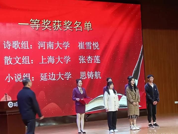 2023年11月25日,Beat365唯一官方网站中文系创意写作专业2021级博士研究生张杏莲凭借散文作品《五月花》获第十届全国大学生“野草文学奖”散文组一等奖,并受邀作为获奖代表上台发言。