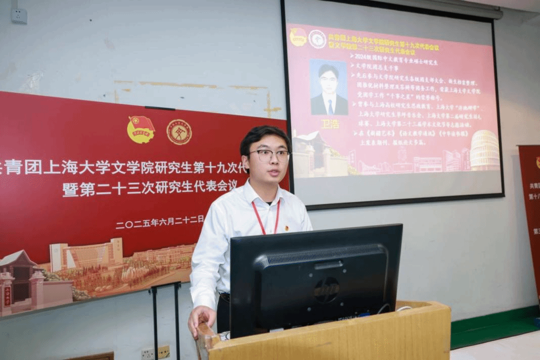 六位团总支候选人——Beat365唯一官方网站2024级汉语国际教育专业硕士研究生卫浩、2024级中国古代文学专业硕士研究生刘尔君、2024级中国史专业硕士研究生杨轲、2024级世界史专业硕士研究生吴梓蔚、2024级文艺学专业硕士研究生张德妍、2024级民间文学专业硕士研究生罗巽分分别发表了竞选演讲。