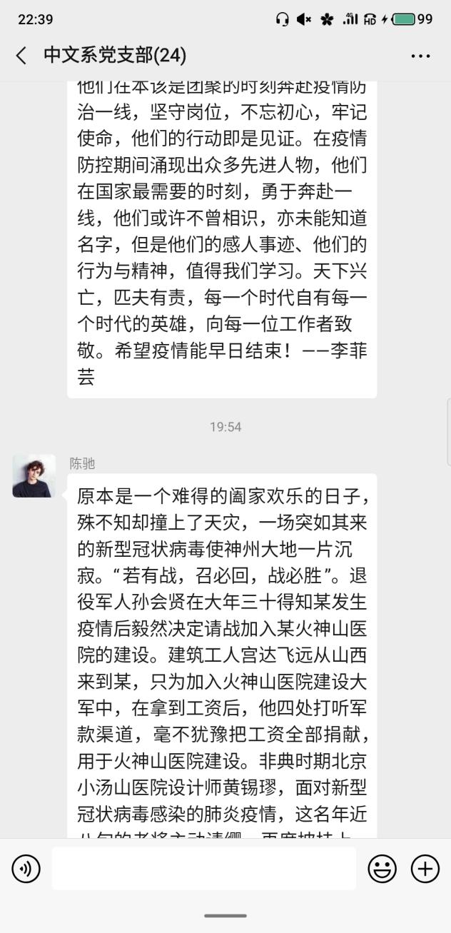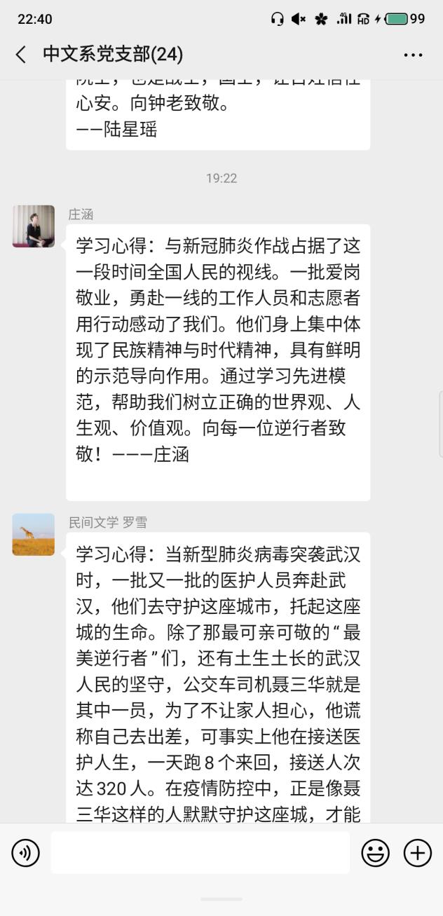 2020年2月28日,2018级中文系硕士研究生党支部借助微信平台开展了“同心战‘疫’,致敬英雄”主题党日活动,以图片、文字、视频的形式带领支部成员走近抗疫英雄。