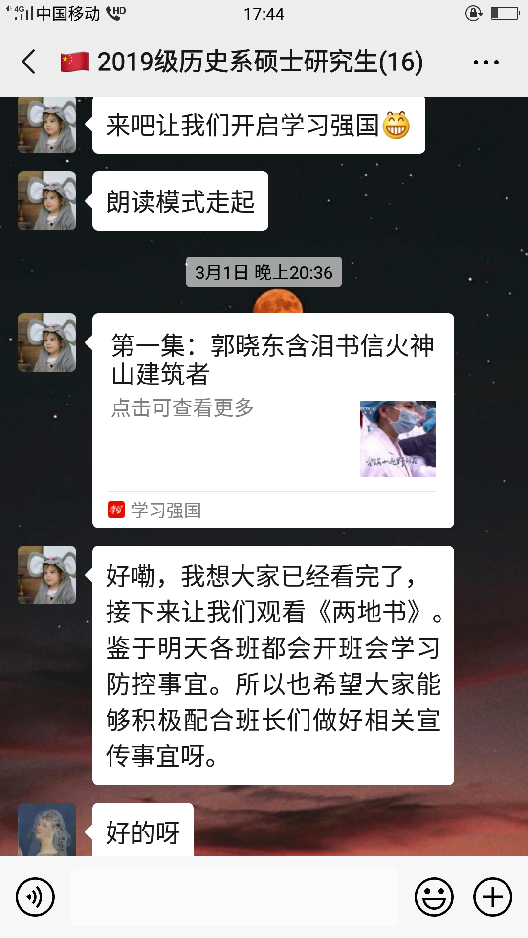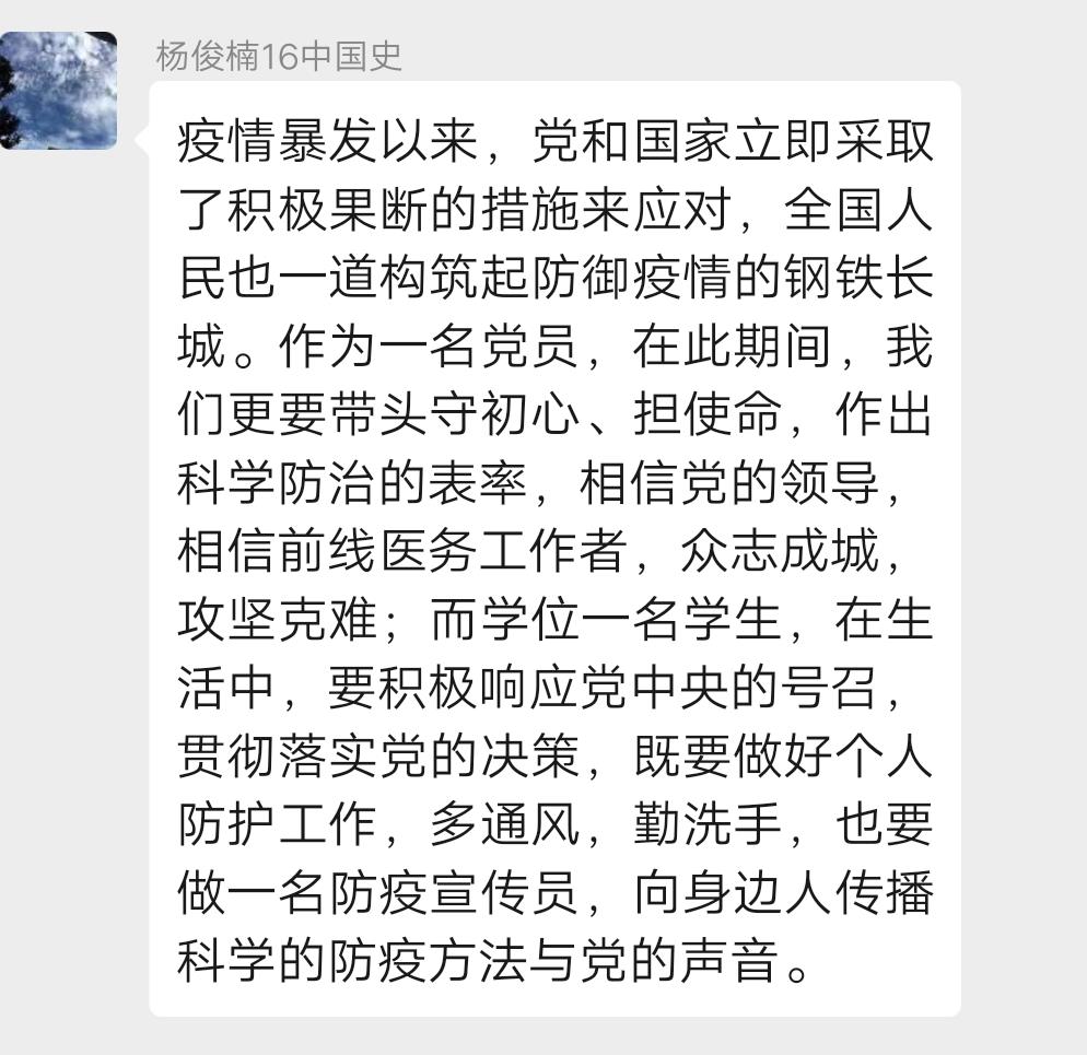 2020年3月1日, 2019级历史系硕士研究生党支部开展疫情防控线上组织生活会议,支部全体党员参加,会议由支部书记纪亚楠同志主持。