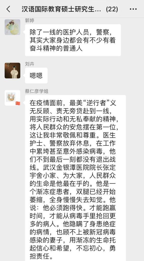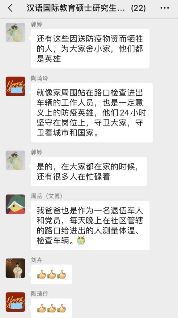 2020年2月27日,汉语国际教育研究生党支部举行线上党日活动,学习抗“疫”英雄的先进事迹,弘扬齐心抗疫精神。全体支部成员参与,会议由支部书记郭婷同志主持。