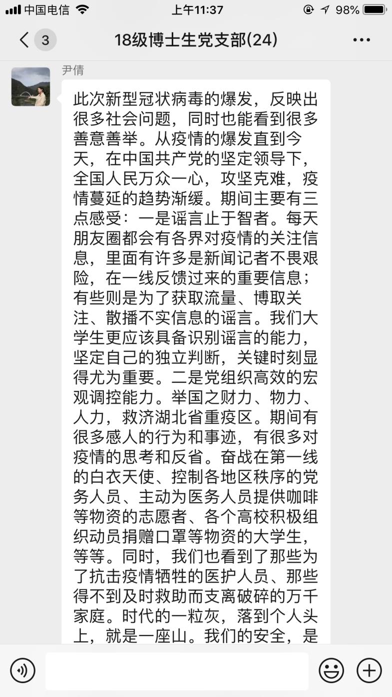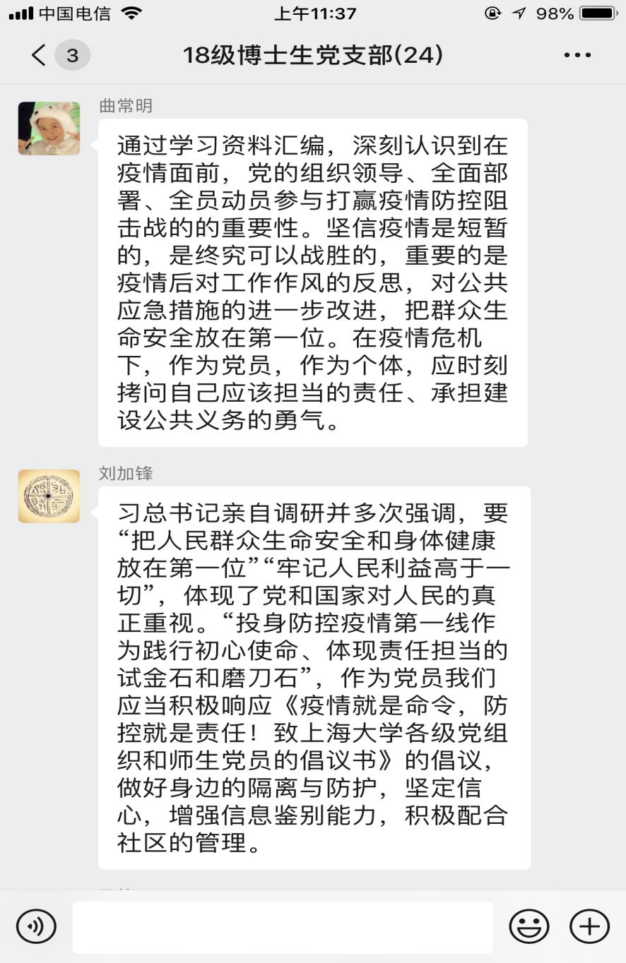2020年2月25日,2018级博士研究生党支部于在支部微信群内开展了线上组织生活会,会议由支部书记许琛琛同志主持,组织委员渠嵩烽同志监督。支部共22名党员,每位同志都自主研习了近期与疫情防控相关的重要文件内容和精神,并于微信群内交流所思所感。