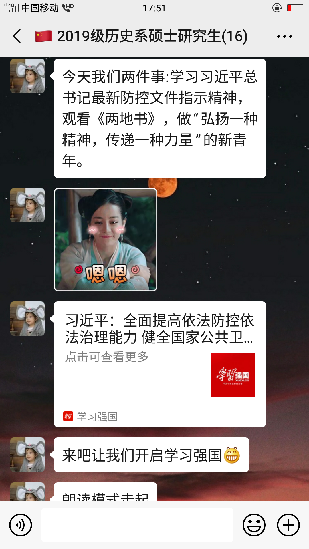 2020年2月27日,2017级中文系硕士研究生党支部在“学习强国”APP支部群内开展以“关注疫情时事,坚定战‘疫’信心”为主题的组织生活会,会议由支部书记苏静如同志主持。