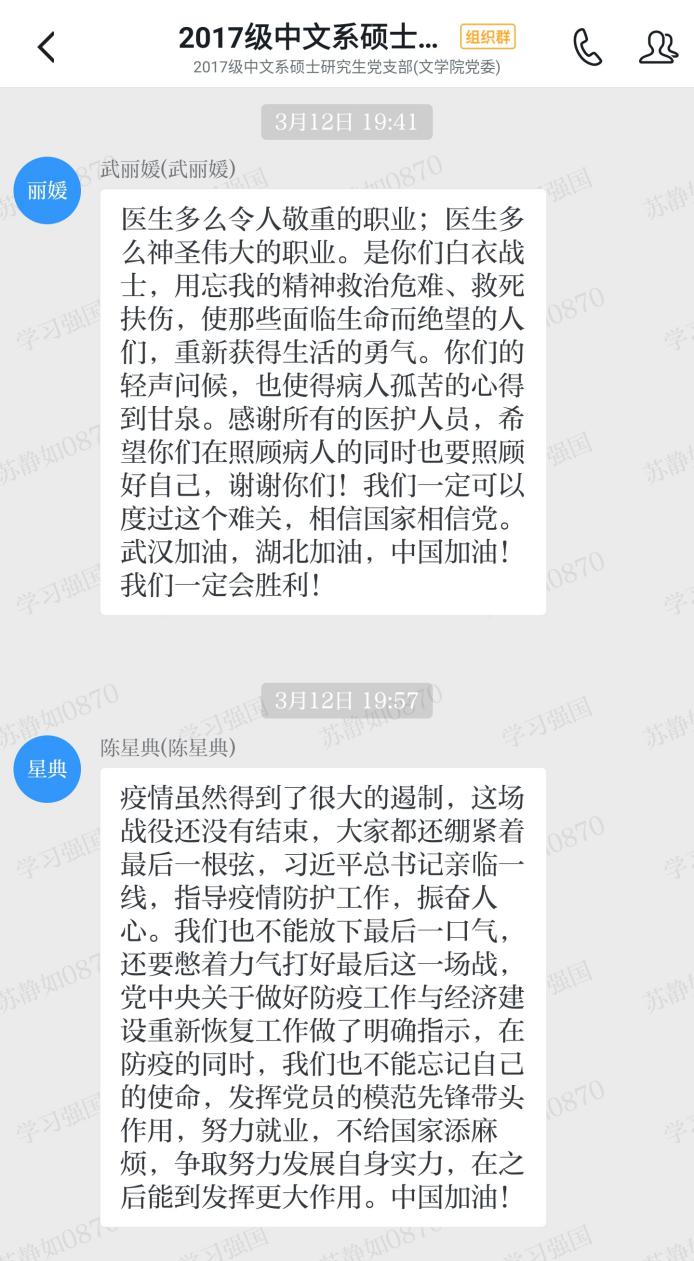 2020年3月12日,2017级中文系硕士研究生党支部全体党员在“学习强国”APP支部群举行以“学习疫情防控文件、致敬一线抗疫先锋”为主题的支部会议,此次会议采用“线下自主学习+线上积极讨论”的形式开展。会议由支部书记苏静如同志主持。