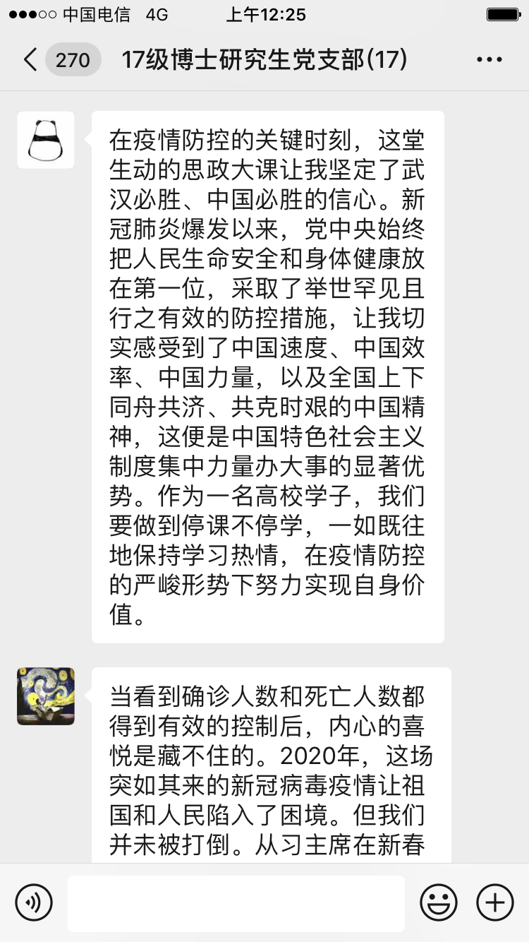 2020年3月13日下午,2019级博士研究生党支部以“学习贯彻习近平总书记关于疫情防控工作的重要指示精神”为主题,通过支部微信群开展线上主题党日活动。会议由支部书记梁爽同志主持。