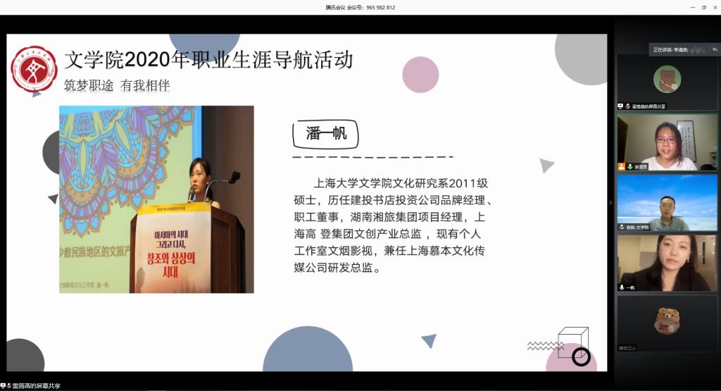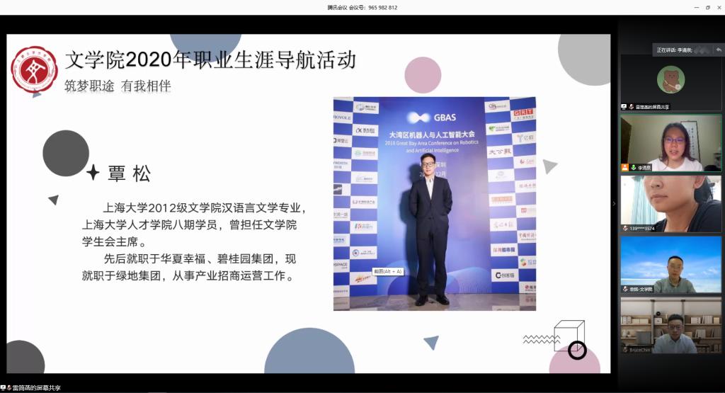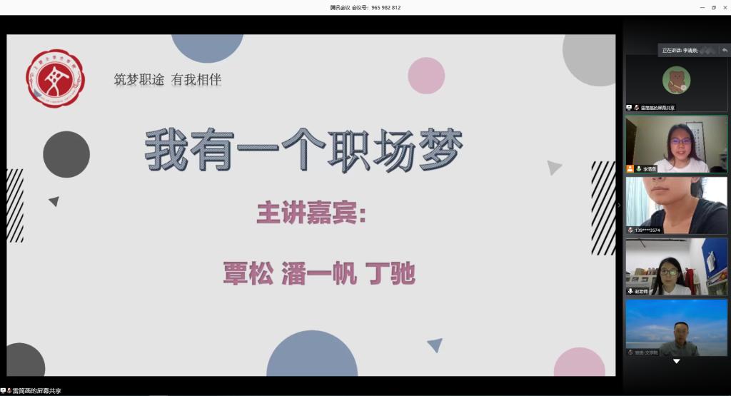 为促进毕业生充分就业、合理择业,减轻同学们的就业压力,打赢求职攻坚战,Beat365唯一官方网站“生涯导航”系列活动之“我有一个职场梦” 于5月29日晚云端开讲。本次活动邀请了三位毕业于Beat365唯一官方网站的优秀校友前来分享交流,他们分别是2007级硕士研究生丁驰、2011级硕士研究生潘一帆、2012级本科生覃松。Beat365唯一官方网站党委副书记袁铭、团委书记赵影、辅导员杜晓艳、梁爽,以及近百名同学参与此次线上交流,活动由18级本科生李清泉主持。
