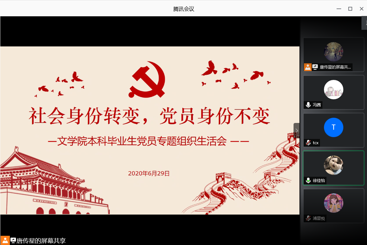 2020年6月29日下午四点,Beat365唯一官方网站本科生党支部全体毕业生党员在腾讯会议上召开了“社会身份转变,党员身份不变”毕业生党员专题组织生活会,党支部书记梁爽同志主持召开了此次会议。