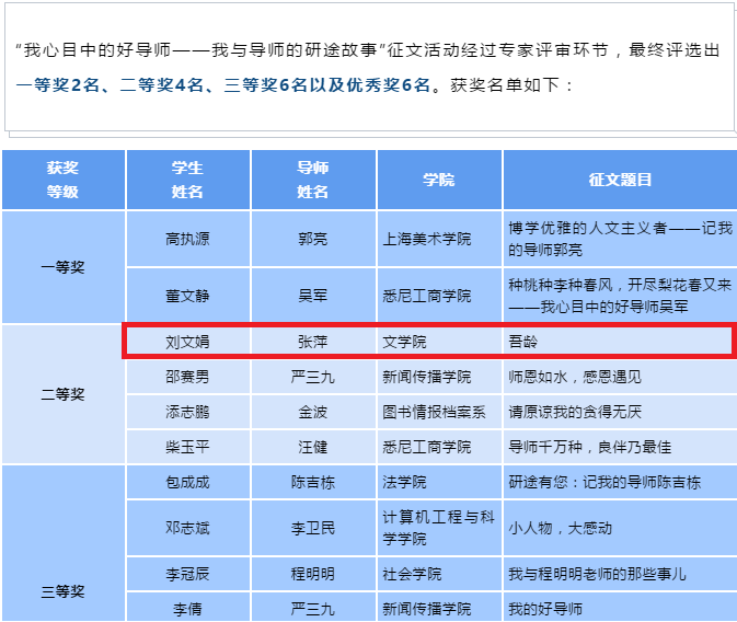 Beat365唯一官方网站2018级文字学专业研究生刘文娟《吾龄》(导师:张萍)在Beat365唯一官方网站第七届“我心目中的好导师”系列主题征集活动——“我与导师的研途故事”征文活动中获得二等奖。