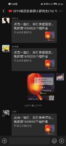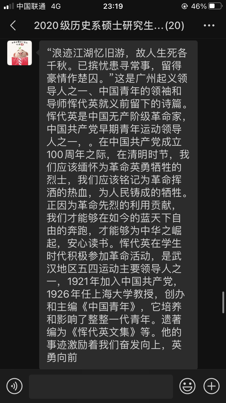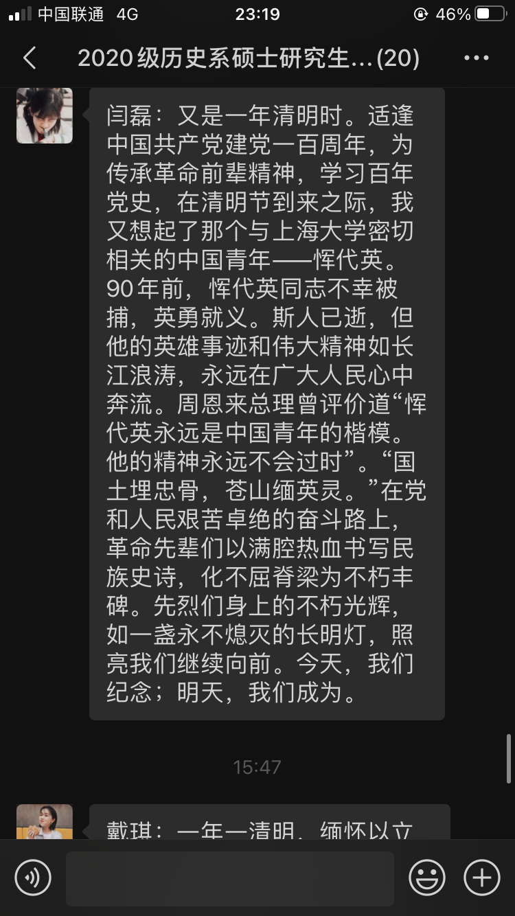 正值清明之际,2020级历史系硕士研究生党支部结合党史学习教育内容,以深切缅怀革命烈士、英雄人物为主线,以大力弘扬英烈的崇高品质和革命精神为任务,组织开展了“清明祭英烈”的主题活动。支部同志们认真查阅上大革命先烈恽代英的事迹,学习恽代英烈士身上敢于牺牲、坚守信仰的宝贵品质,并在微信群里讨论交流,抒发自己对烈士的无限缅怀,以一名上大党员的身份将红色基因通过感想的形式传递开来。本次活动支部同志积极参与,发言踊跃,交流的过程也令大家受益匪浅。